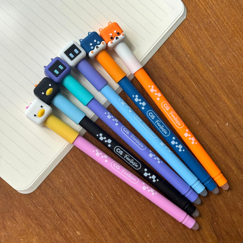 Caneta gel apagável com tinta azul e tampa super fofa com tema de bichinhos!! É possível apagar a escrita friccionando a borracha de baixo da caneta contra a tinta.
